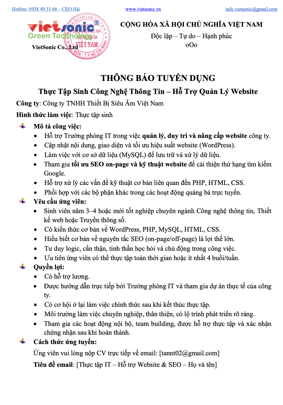 Công ty TNHH Thiết Bị Siêu Âm Việt Nam đang có nhu cầu tuyển dụng như sau: